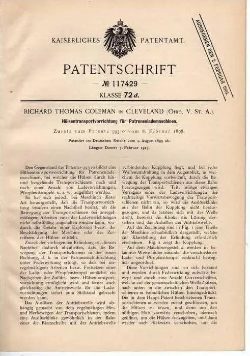 Original Patentschrift - Th. Coleman in Cleveland , Ohio , 1899 , Patronenlademaschine , Patronen !!!