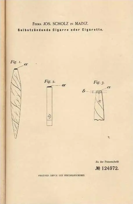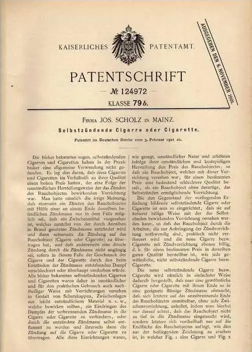 Original Patentschrift - selbstzündende Cigarre oder Cigarette , 1901 , J. Scholz in Mainz , Zigarette !!!