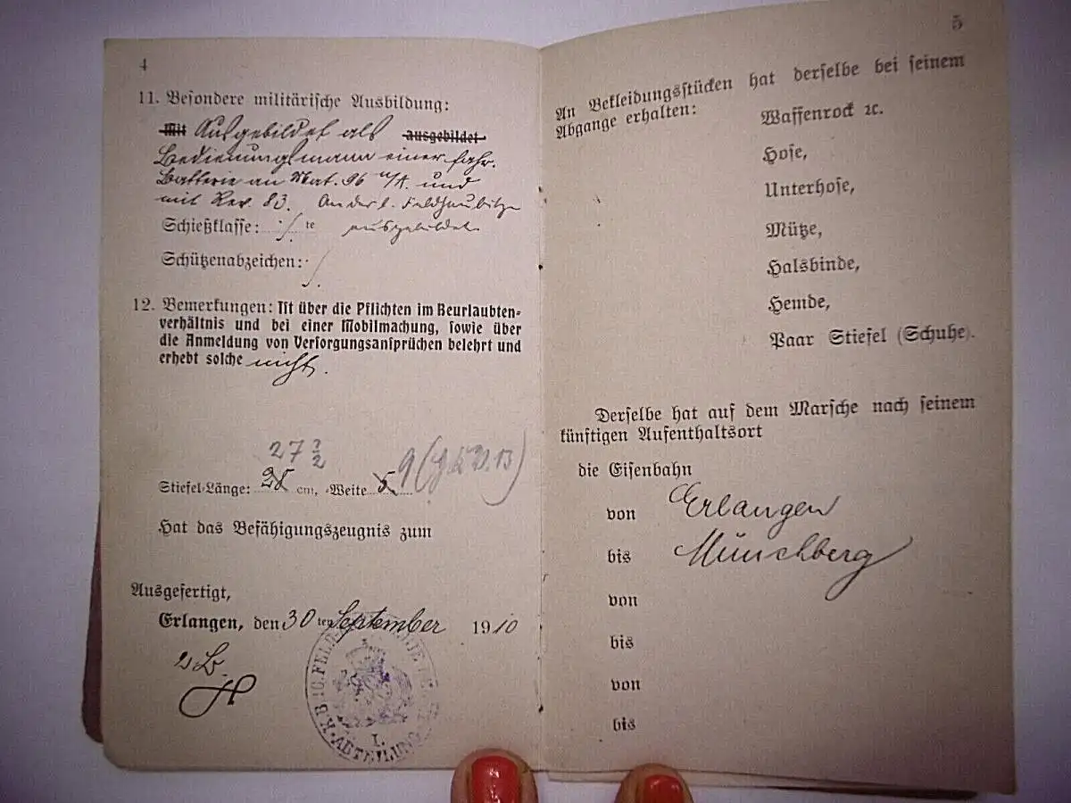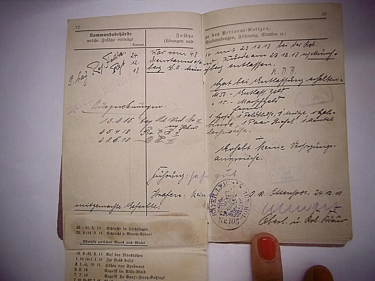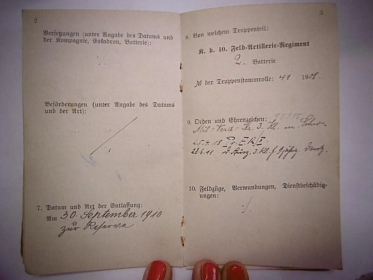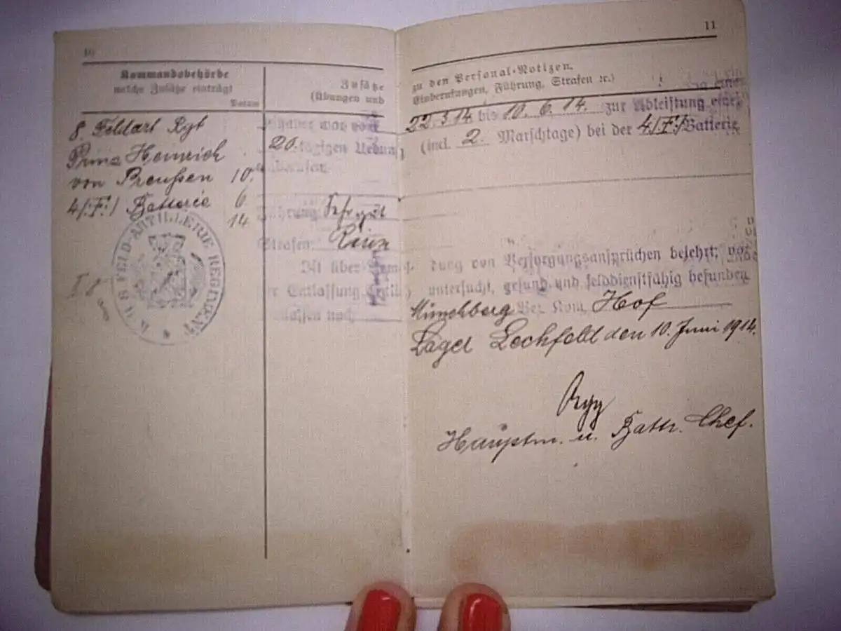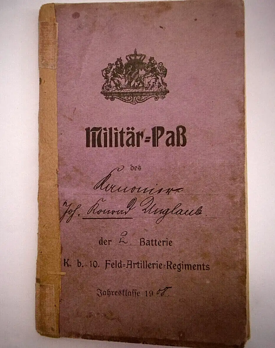 Biete hier einen originalen Militärpaß eines Soldaten des 10. Feld Artillerie Regiments aus 1908. Der Paß enthält diverse Eintragungen mit EK II und vielen Kämpfen und Gefechten, vgl. dazu auch die Bilder. Zst.: Der Paß war die ganzen Jahre im Krieg mit dabei, trotzdem befindet er sich in einem ordentlichen, sammelwürdigen Zustand mit normalen Altersspuren, der Rücken ist geklebt, Zst. vgl. auch Bilder. Maße: ca. 15 x 9 cm (zusammengeklappt)