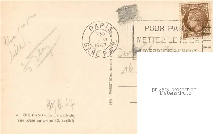 Orleans_Loiret Cathedrale Fliegeraufnahme Orleans_Loiret postalisch gelaufen 1947 Erhaltung siehe scans [LiesaD40] LiesID40