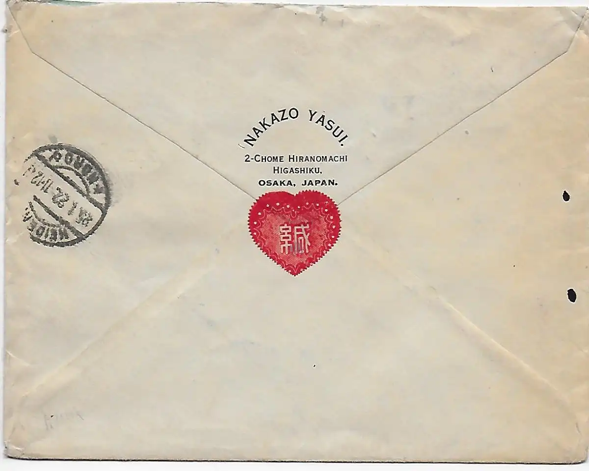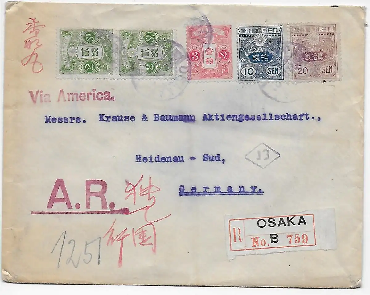 Osaka Einschreiben 1922 mit Rückschein nach Heidenau