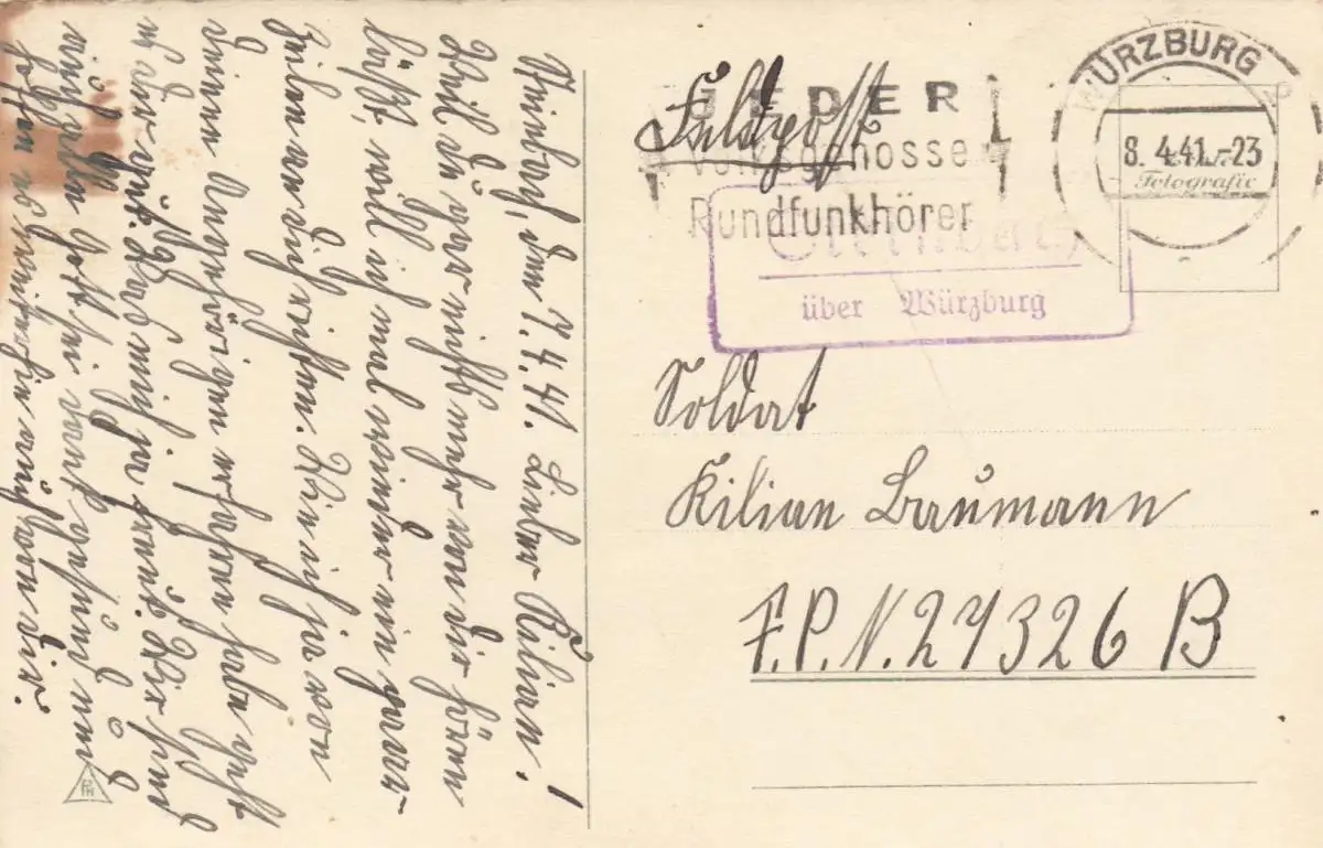 Osterkarte Feldpost Steinbach über Würzburg an FPNr. 27326
