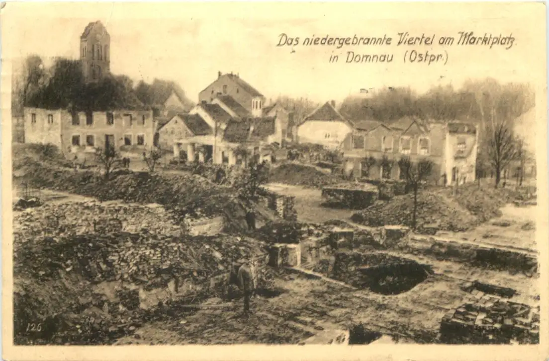 Ostpreussen - Niedergebranntes Viertel am Marktplatz in Domnau -685292