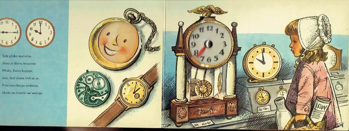 guter Zustand, Gebrauchs- und Alterungsspuren: Leinen an Rückenober- und -unterkante etwas zerfasert (es fehlen ca. 3-5 mm) - Einbandecken und -kanten teils gering abgenutzt - Einband teils etwas beschabt, teils gering zerkratzt - Rückseite an der rechten oberen Ecke leicht gestaucht / gering angeknickt - Bildtafeln sauber und ordentlich - vorletzte Bildtafel diagonal etwas angeknickt - Zifferblatt war bekritzelt, einige Druckstellen nach dem Radieren, We jstwě hnydom pri łóžku budzak steji na blidku. Budźak zwoni, zwoni, Janka z łóžka honi:Stawaj, Janko, ruce zběhń, rańši sport čiń kóždy dźeń! Ausgabe in sorbischer Sprache für die Lausitz / Sachsen / DDR, Halbleinen, ca. 22,5 x 16, 7 kartonierte Tafeln mit 14 Bildern