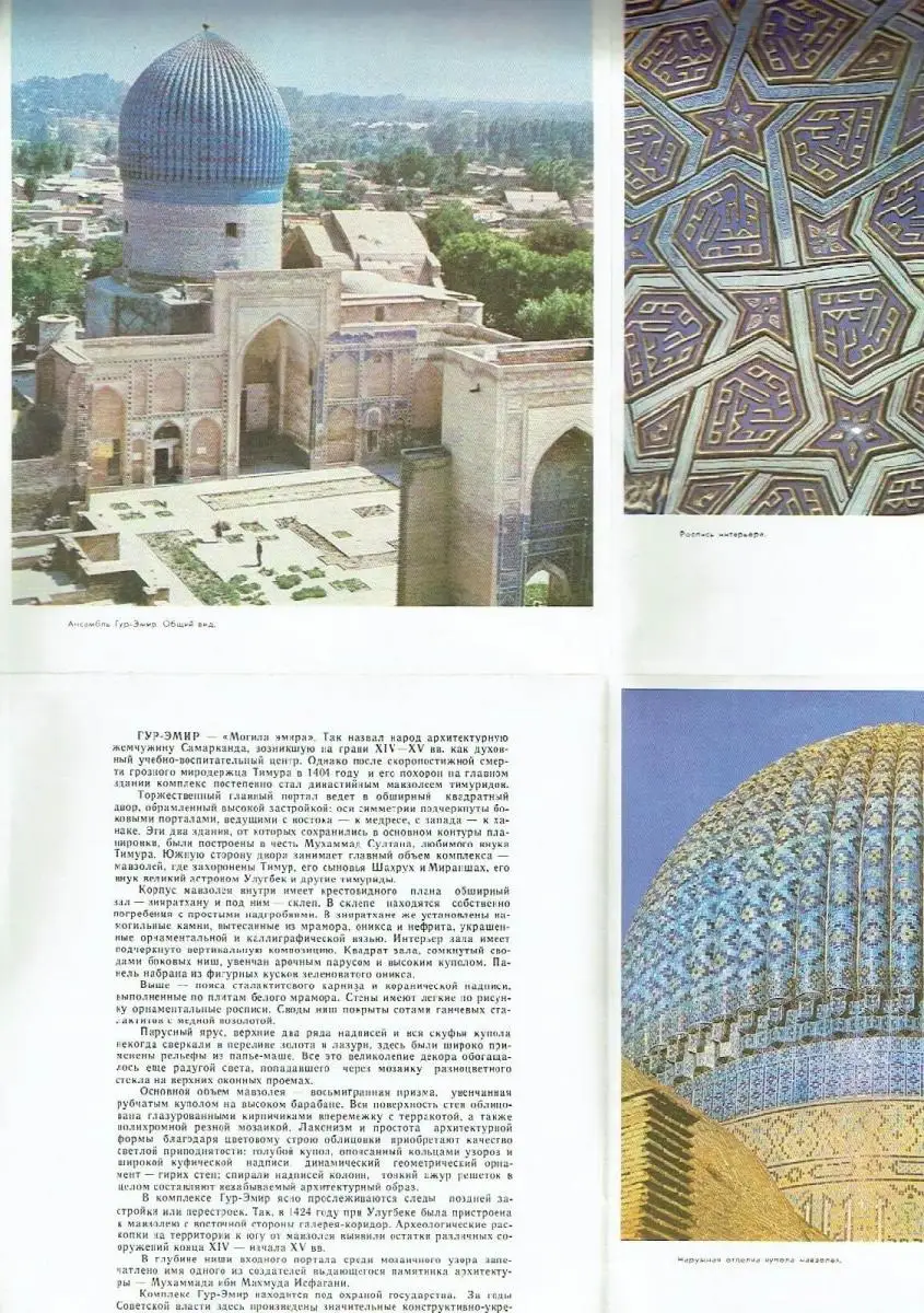 guter bis sehr guter Zustand, geringe Gebrauchs- und Alterungsspuren: Ränder teils mit kleinen Blessuren, Werbe-Prospekt mit Beschreibung und Informationen zum Timur-Lenk-Mausoleum in Samarkand in Usbekistan in russischer Sprache, Papier, ca. 19,5 x 24,5, 12 Seiten mit 14 Bildern
