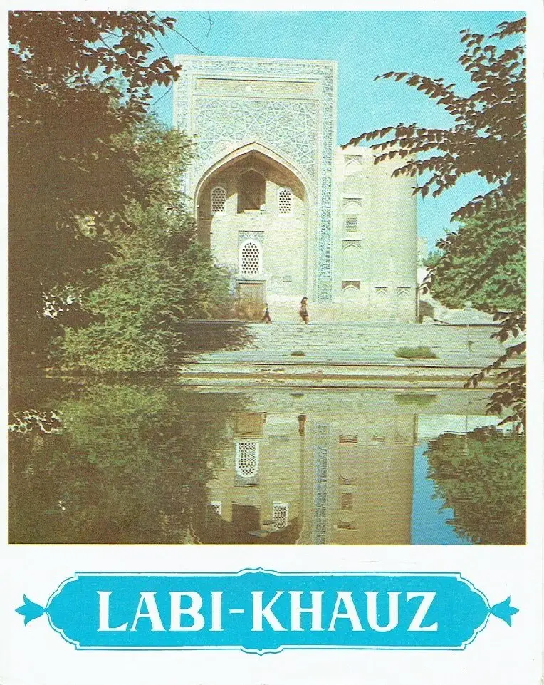 guter bis sehr guter Zustand, geringe Gebrauchs- und Alterungsspuren: Ränder teils mit kleinen Blessuren, Labi-Khauz (Hovuz) ist ein Gebäudeensemble in der usbekischen Stadt Buchara - Werbe-Prospekt mit Beschreibung und Informationen zur Stadt in Usbekistan in englischer Sprache, Papier, ca. 19,5 x 24,5, 12 Seiten mit 14 Bildern