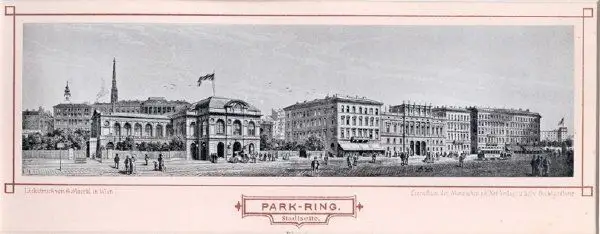 Wien, Manz´sche k.k. Hof- Verlags- u. Univ. Buchhandlung (ca. 1885). Photogr. Lichtdruck v. G. Markl nach den Holzstichen v. Bader u. Petrovits aus "Miniatur-Album der Wiener Ringstrase". Blattgröße 14,5 x 31 cm., Bildausschn. 7 x 25 cm. Auf Orig.-Karton aufgezogen. Unter Passepartout.