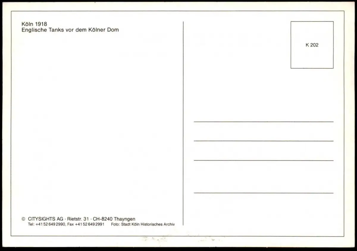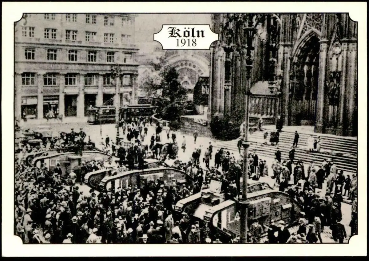 POSTKARTE KÖLN ENGLISCHE TANKS VOR DEM DOM 1918 - REPRODUKTION