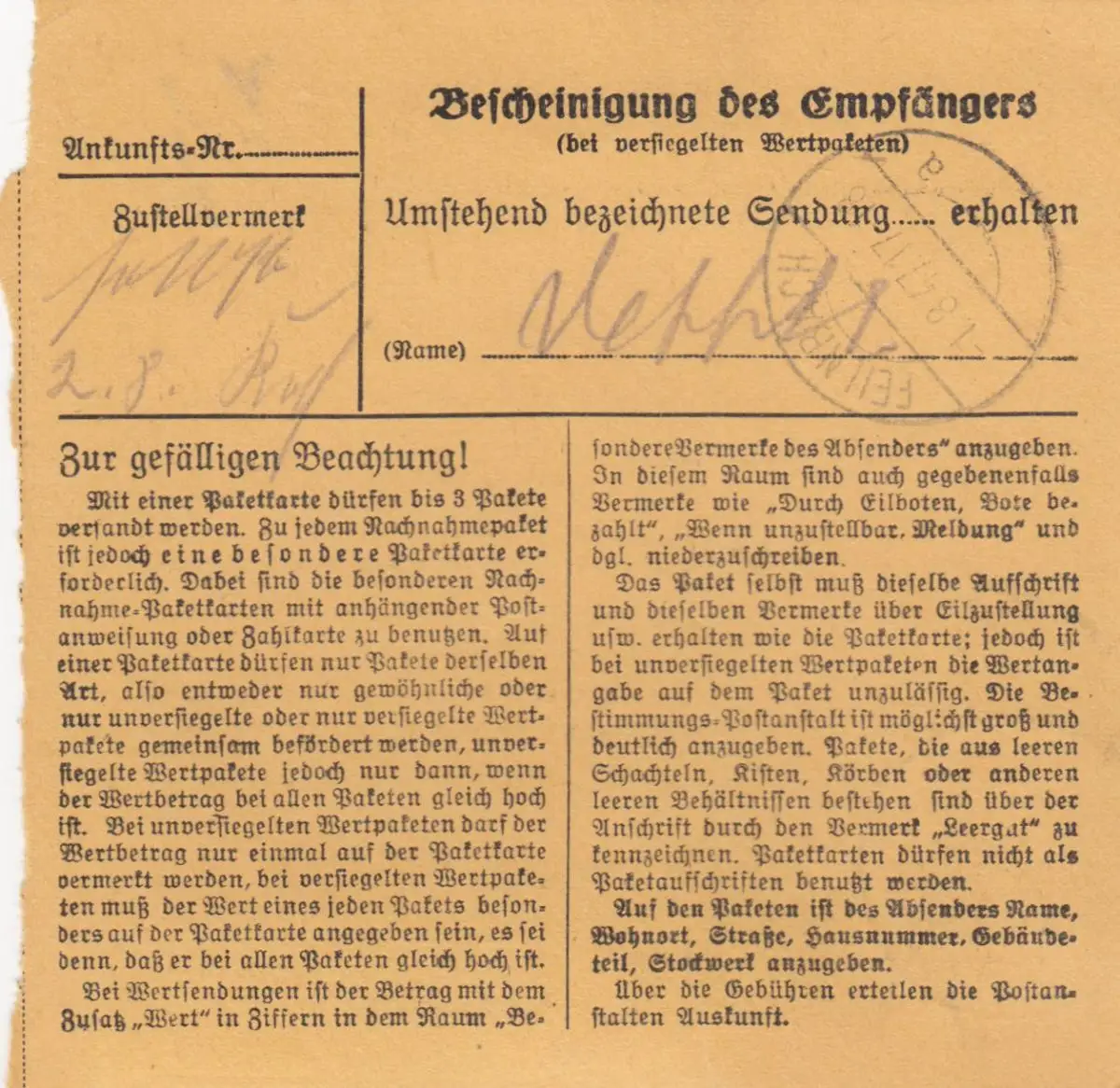 Paketkarte 1947: München 19 nach Jenbach, Holzhandlung