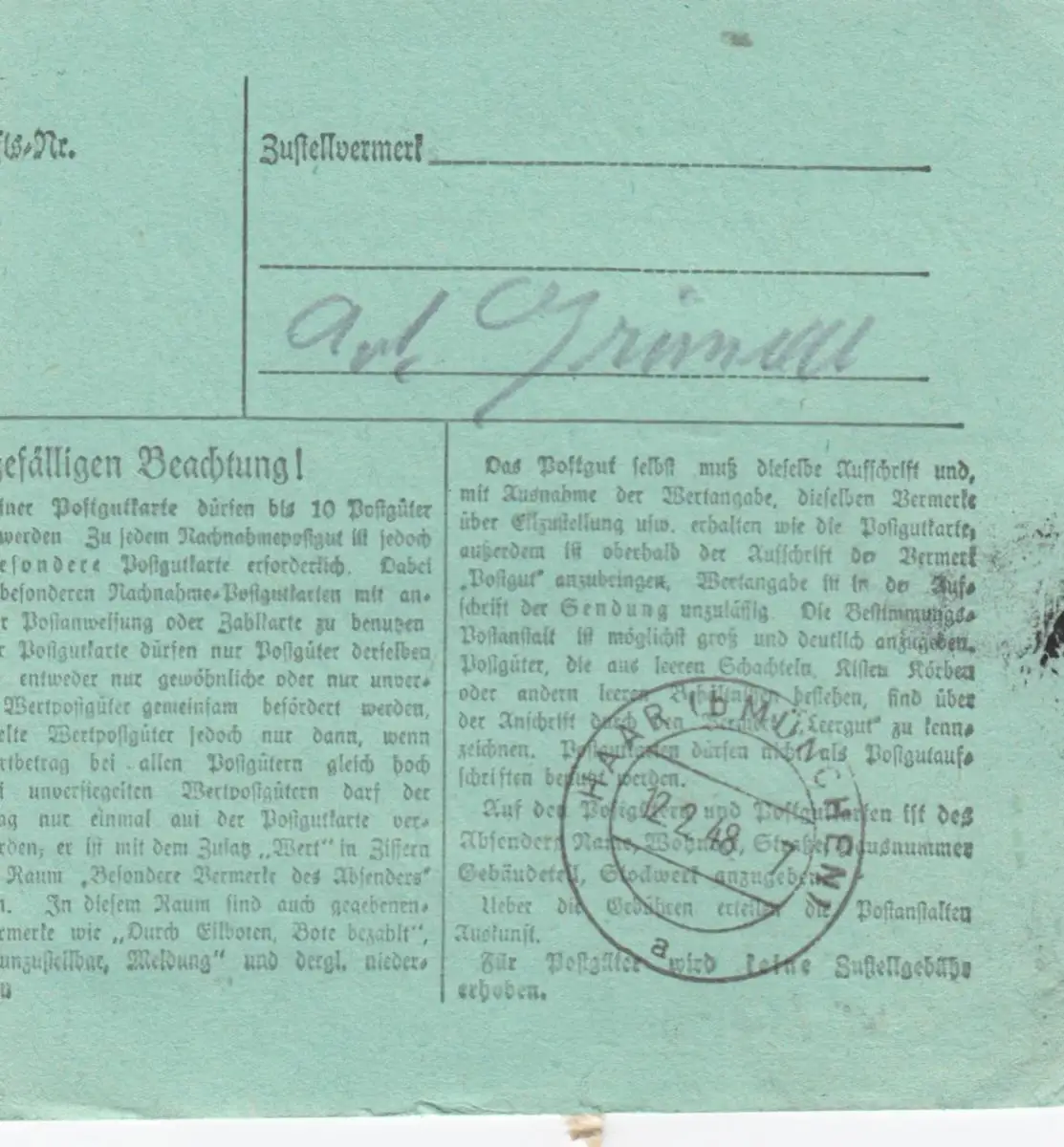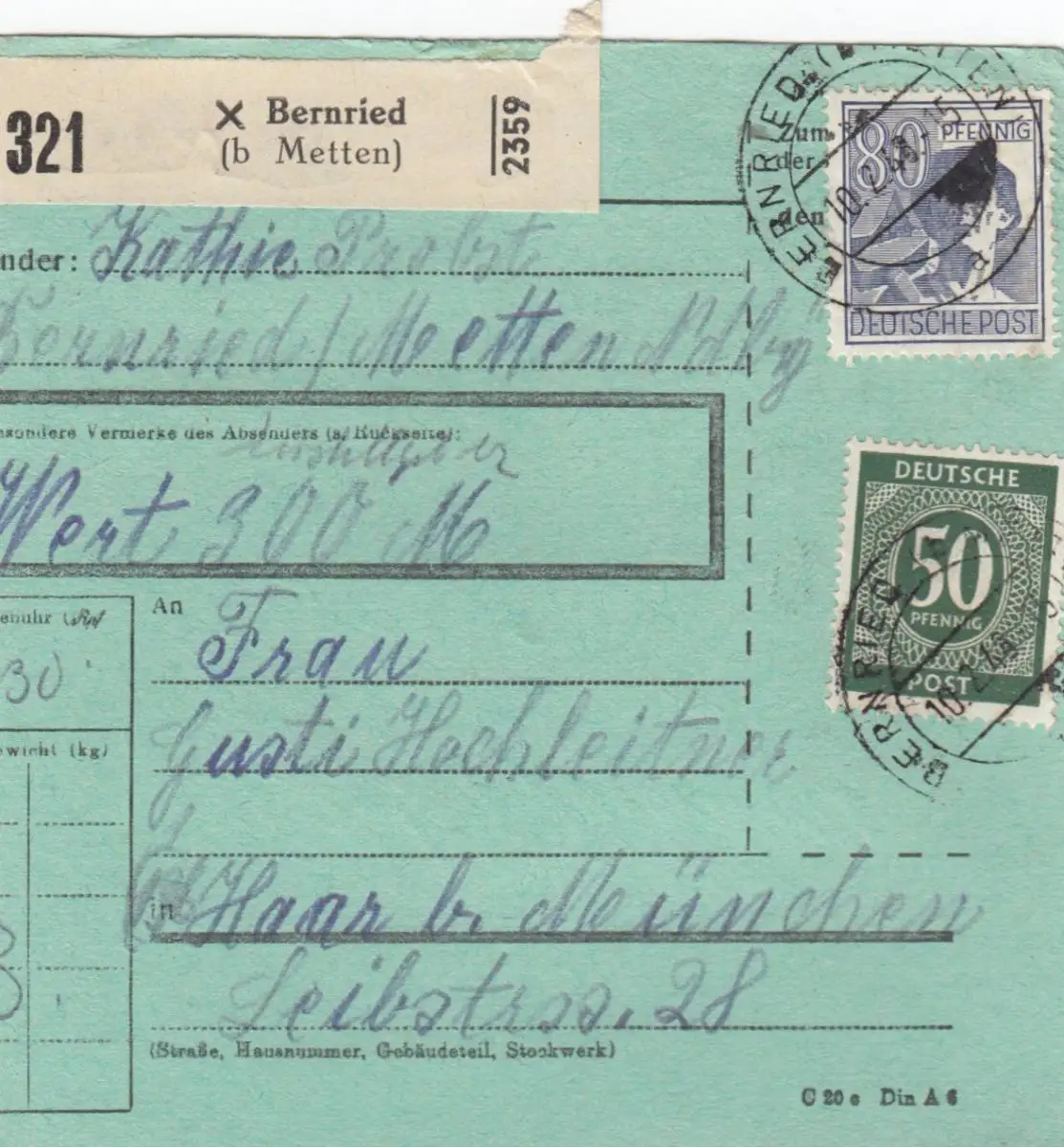Paketkarte 1948: Bernried Metten nach Haar, besonderes Formular