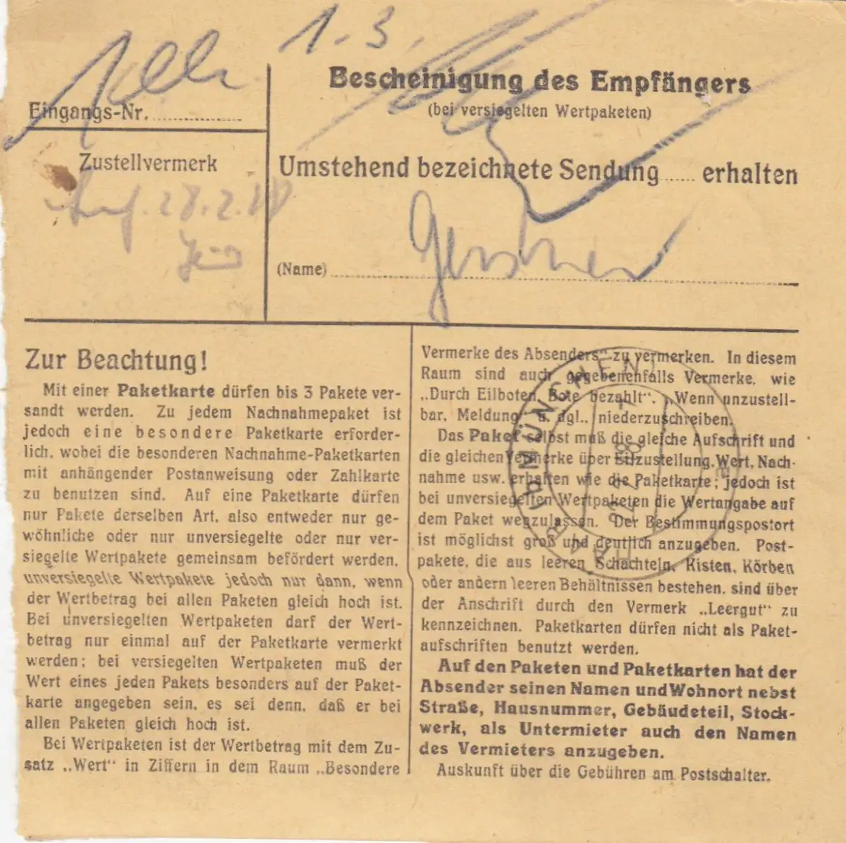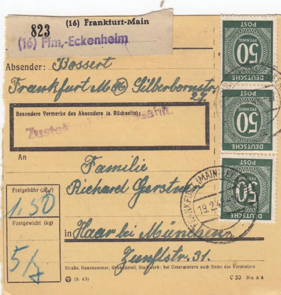 Paketkarte 1948: Frankfurt Eckenheim nach Haar