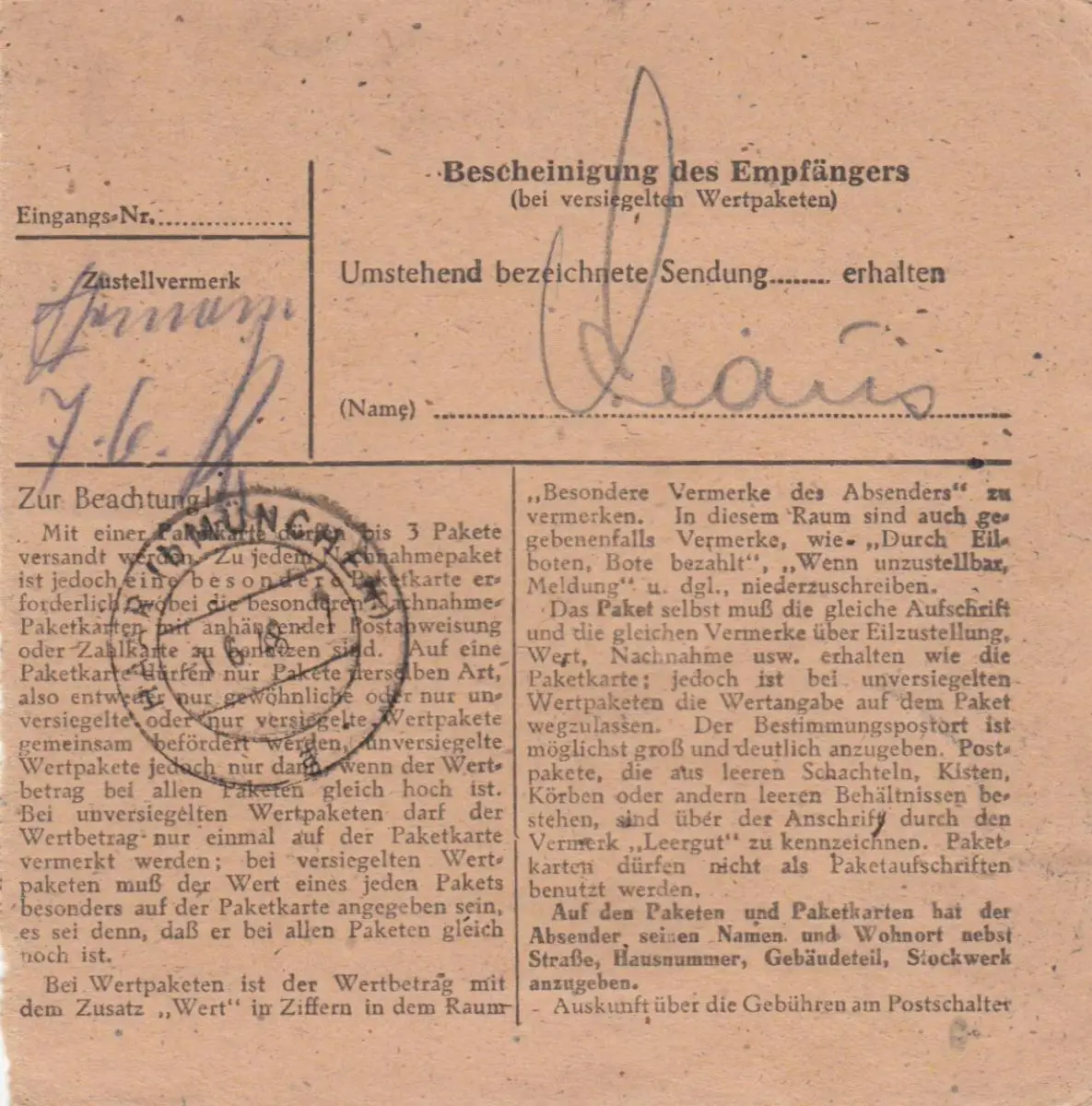 Paketkarte 1948: Göttingen nach Haar, Wertkarte