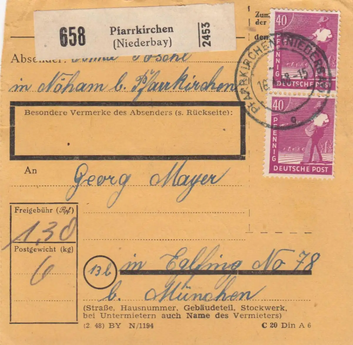 Paketkarte 1948: Pfarrkirchen nach Eglfing nach München