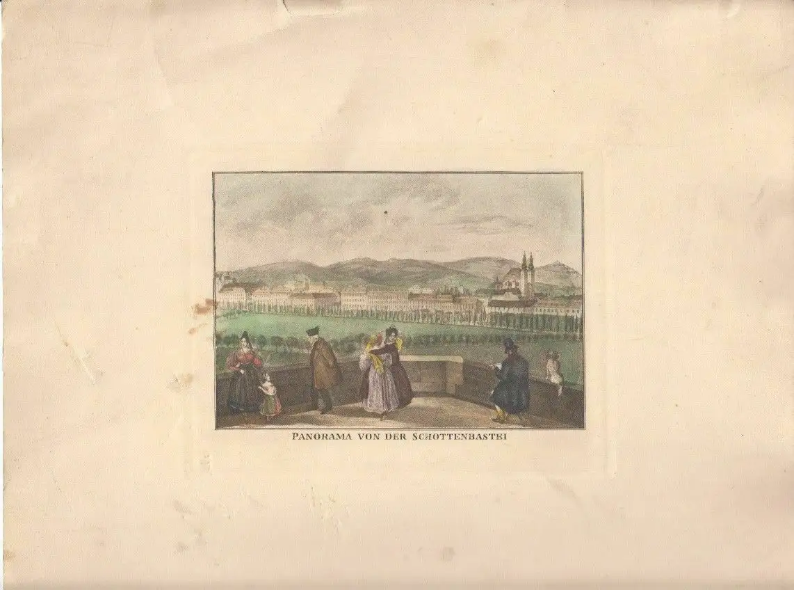 Bemerkungen: Nebehay-W. 849, 45 - Im Vordergrund die Schottenbastei mit ihren Besuchern - im Mittelgrund das Glacis und die Stadt, Im Hintergrund Leopoldsberg, Kahlenberg und der Cobenzl. Aus: "Journal pittoresque".