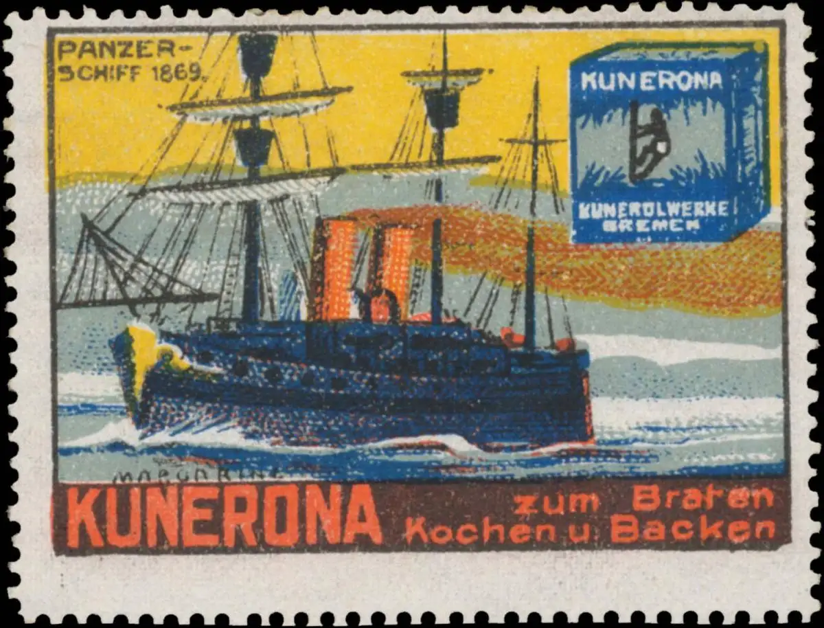 Panzer-Schiff, Kunerona Margarine zum Braten, Kochen und Backen, Größe/Zustand: 4x6 , guter Zustand, Original alte Reklamemarke die seinerzeit für die Werbung benutzt wurde