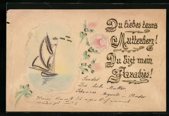Papierkunst-AK Blumen und Segelboot mit gezeichneten Details