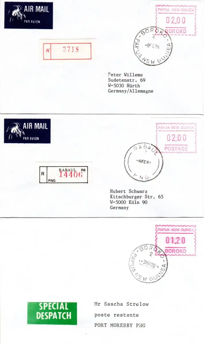 Papua Neu Guinea, 3 Briefe m. Automatenmarken, dabei 2x Reko