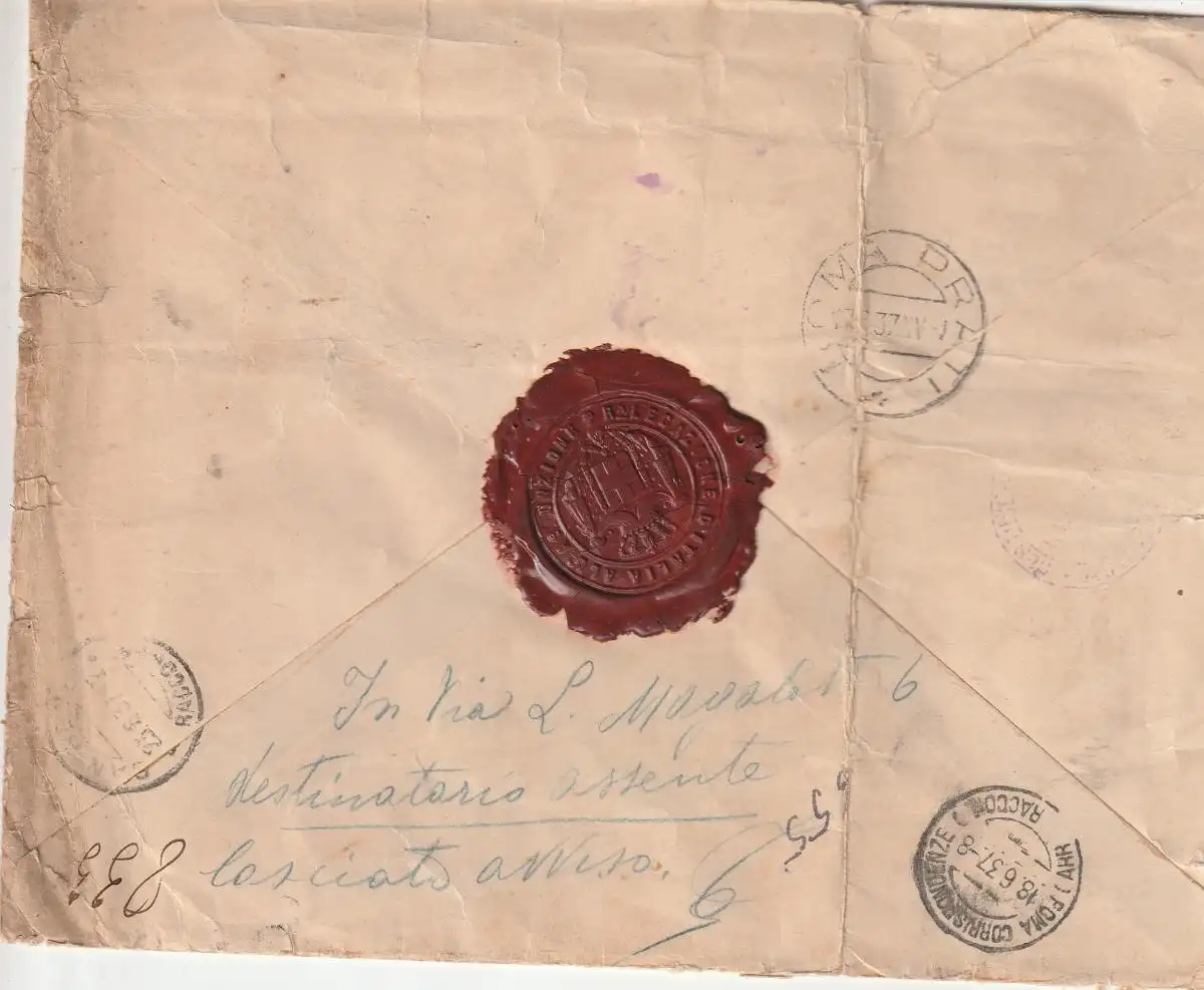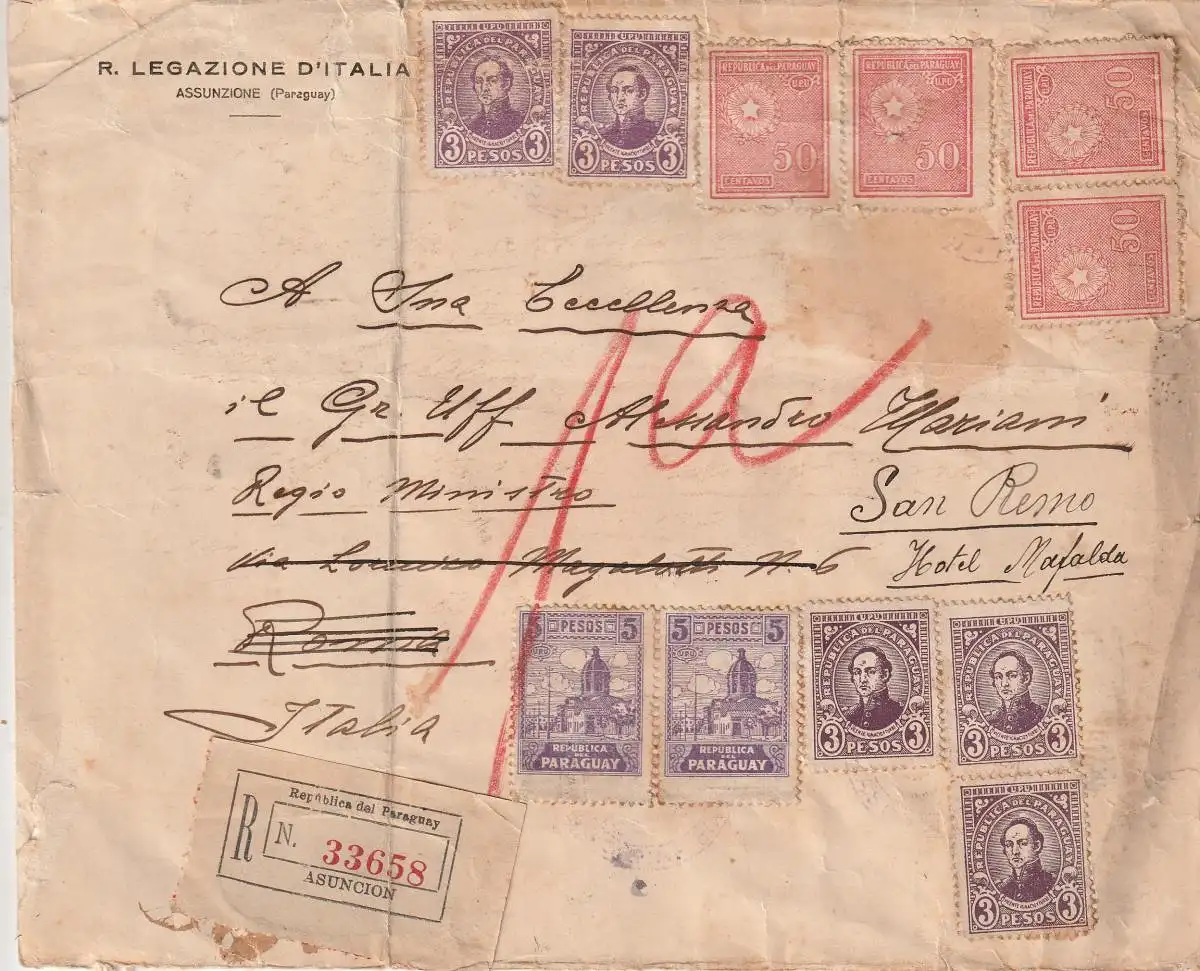 PARAGUAY - 1937, Einschreiben der italienischen Botschaft nach Rom / San Remo mit Botschaftssiegel, mäßige Erhaltung
