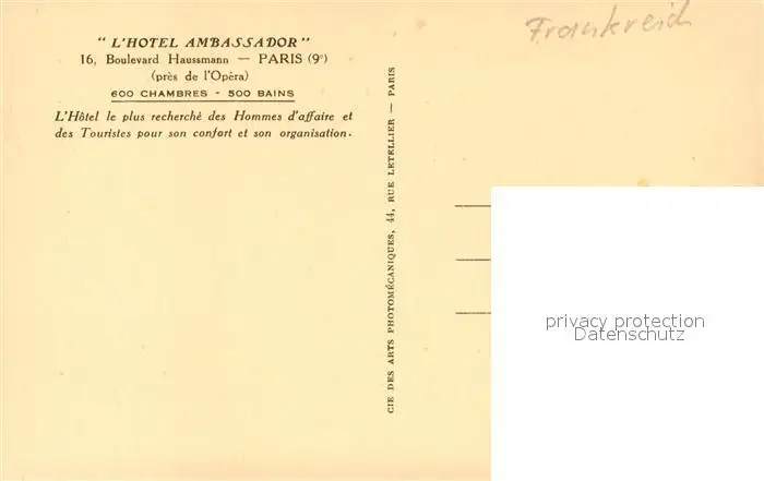Paris Hotel Ambassador Paris postalisch nicht gelaufen bis 1920 Erhaltung siehe scans [LiesaD40] LiesID40
