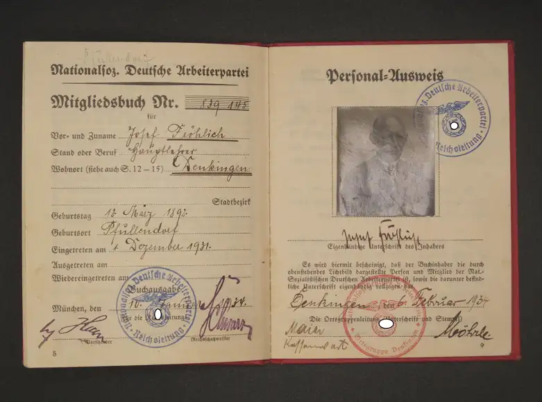 – Parteibuch, frühe Form, sehr guter Zuständig. Mit allen Seiten und Foto. Beitragsmarken und 1929 bis 1934. In der seltenen Schutzhülle