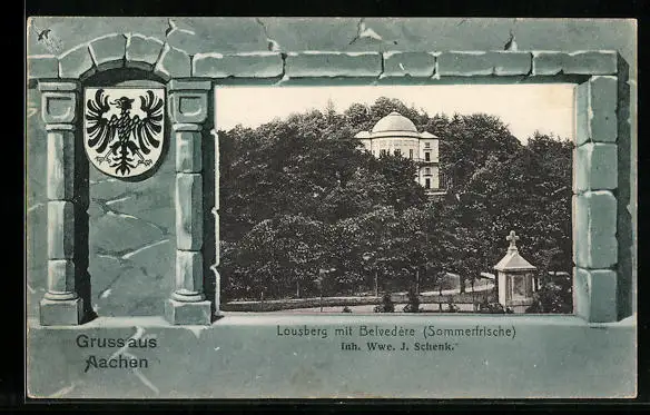 Passepartout-AK Aachen, Lousberg mit Gasthaus Belvedere Wwe. J. Schenk, Wappen