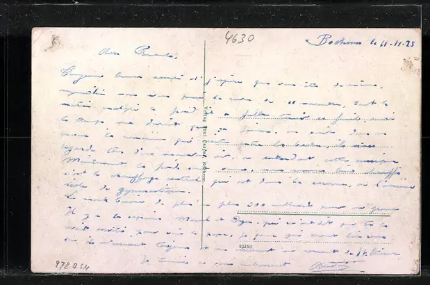 Personenbezogene Daten auf der Rückseite der Karte wurden durch blauen Textmarker unkenntlich gemacht. Die blauen Stellen sind auf die Vorderseite durchgeweicht und wirken sich negativ auf das Postkartenfoto aus