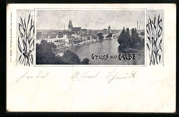 Passepartout-AK Calbe a. S., Teilansicht mit Brücke aus der Vogelschau, Wasserpflanze