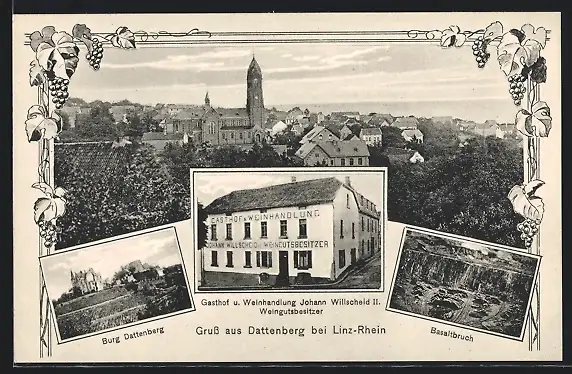 Passepartout-AK Dattenberg, Basaltbruch, Burg, Ortsansicht