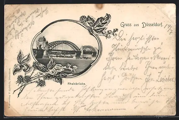 Passepartout-AK Düsseldorf, Rheinbrücke, Brombeerzweig