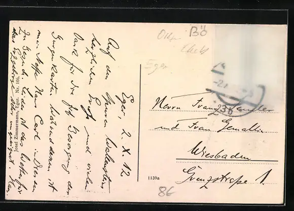 gelaufen 1912, Briefmarke entfernt, rückseitig Klebe- und Papierreste, guter Zustand