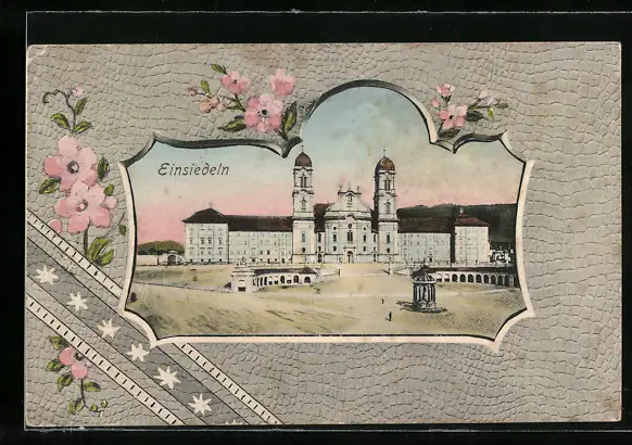 Passepartout-AK Einsiedeln, Kirche mit Vorplatz