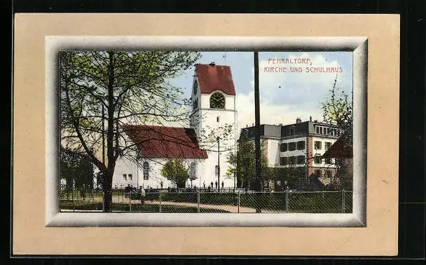 Passepartout-AK Fehraltorf, Kirche und Schulhaus