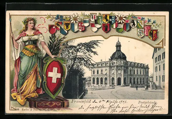 Passepartout-AK Frauenfeld, Strassenpartie am Postgebäude, Helvetia mit Wappen