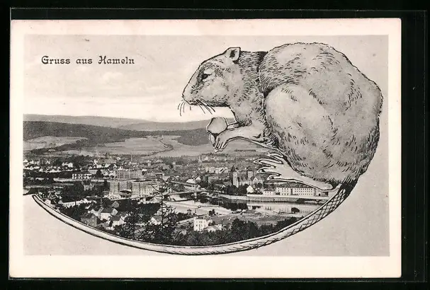 Passepartout-AK Hameln, Ortsansicht mit Ratte