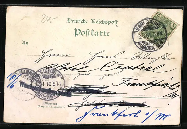 Personenbezogene Daten auf der Rückseite der Karte wurden durch blauen Textmarker unkenntlich gemacht. Die blauen Stellen sind auf die Vorderseite durchgeweicht und wirken sich negativ auf das Postkartenfoto aus