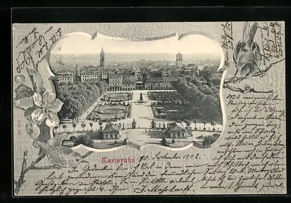 Passepartout-AK Karlsruhe, Ortsansicht vom Schloss aus, Vögel
