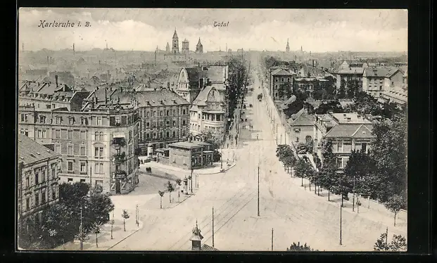 Passepartout-AK Karlsruhe i. B., Totalansicht mit Strasse aus der Vogelschau