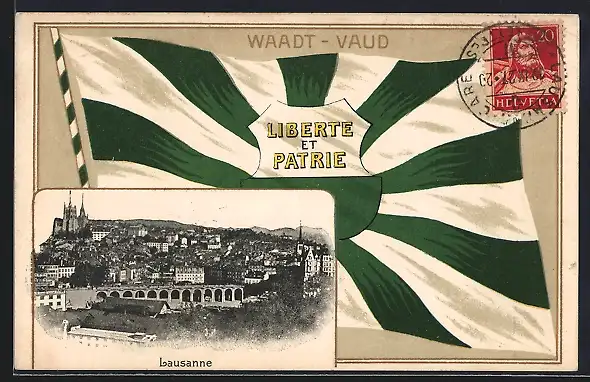 Passepartout-AK Lausanne / Vaud, Ortsansicht und Flagge