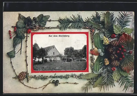 Passepartout-AK Moritzberg, Gebäude auf dem Moritzberg, umrahmt von einem Tannen-Stilleben