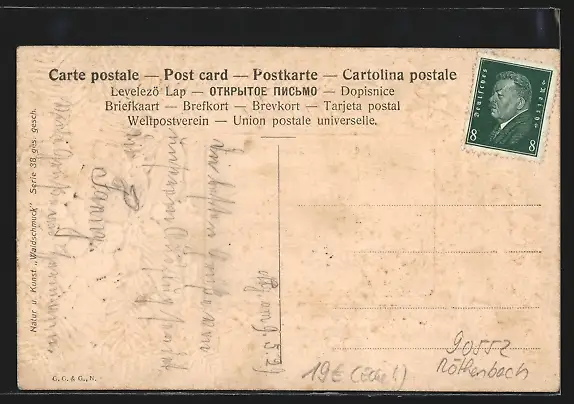 Personenbezogene Daten auf der Rückseite der Karte wurden durch blauen Textmarker unkenntlich gemacht. Die blauen Stellen sind auf die Vorderseite durchgeweicht und wirken sich negativ auf das Postkartenfoto aus