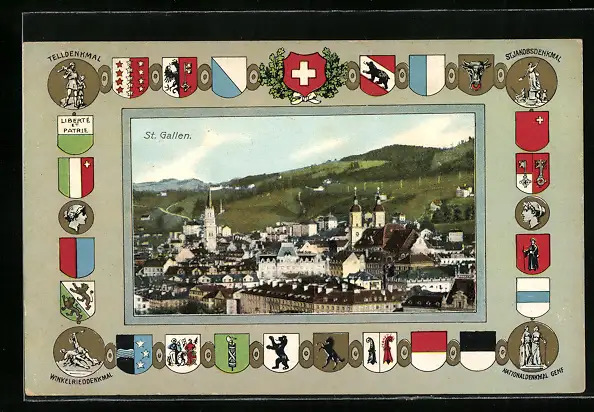 Passepartout-AK St. Gallen, Telldenkmal, Ortsansicht, Nationaldenkmal Genf, St. Jakobsdenkmal und Wappen