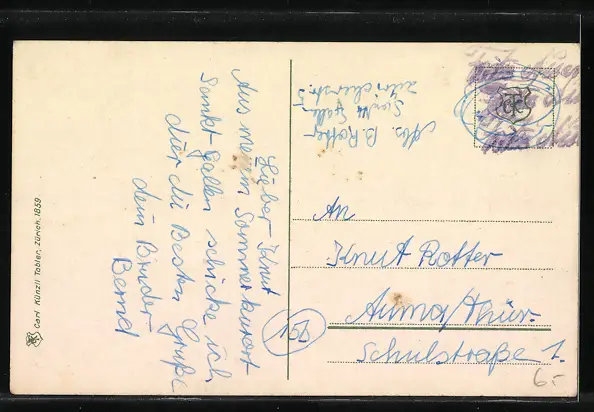 Personenbezogene Daten auf der Rückseite der Karte wurden durch blauen Textmarker unkenntlich gemacht. Die blauen Stellen sind auf die Vorderseite durchgeweicht und wirken sich negativ auf das Postkartenfoto aus