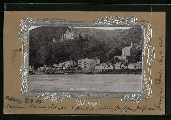 Passepartout-AK Stolzenfels, Ortsansicht mit Uferpartie
