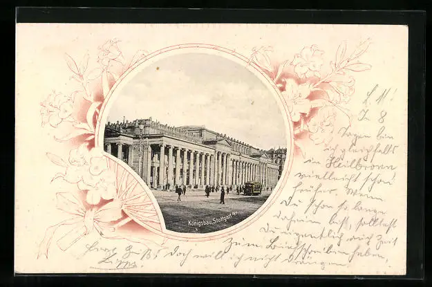 Passepartout-AK Stuttgart, Königsbau und Strassenbahn, Geprägte Blumen