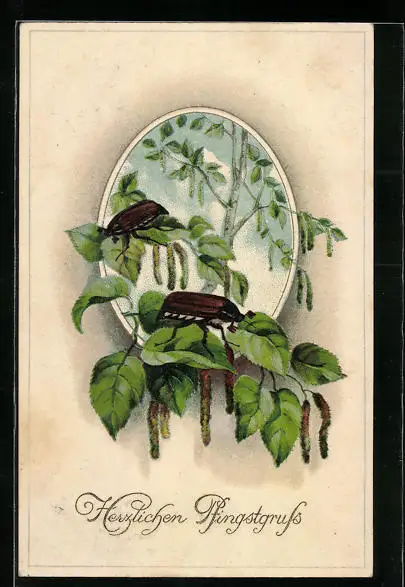 Passepartout-AK Zwei Maikäfer auf Birkenzweig vor Birke, Pfingstgruss