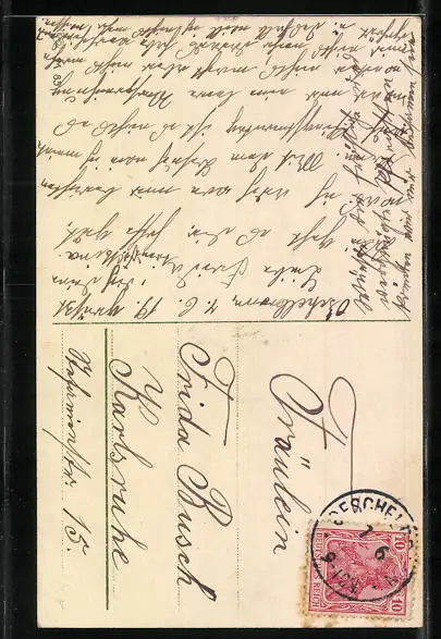 Personenbezogene Daten auf der Rückseite der Karte wurden durch blauen Textmarker unkenntlich gemacht. Die blauen Stellen sind auf die Vorderseite durchgeweicht und wirken sich negativ auf das Postkartenfoto aus