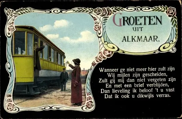 Passepartout Ak Alkmaar Nordholland, Mann in Straßenbahn, Frau winkt zum Abschied