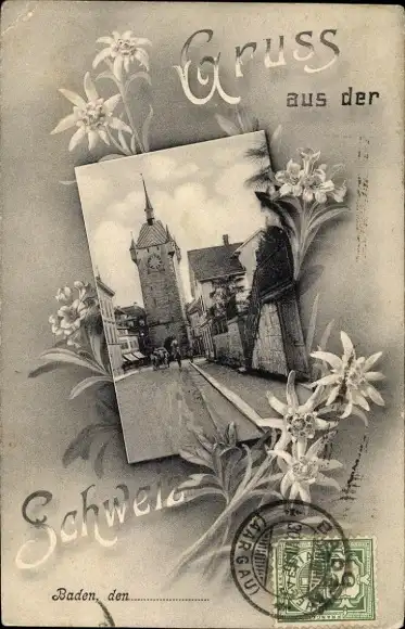 Passepartout Ak Baden Kanton Aargau Schweiz, Straßenansicht, Uhrenturm, Edelweiß