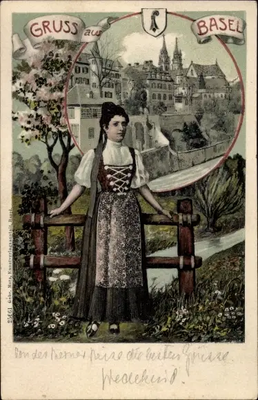 Passepartout Ak Bâle Basel Stadt Schweiz, Frau in Tracht, Stadtansicht