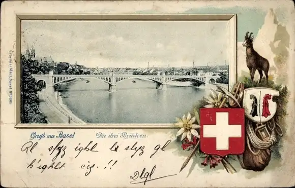 Passepartout Ak Basel Bâle Stadt Schweiz, Die drei Brücken, Wappen, Bock